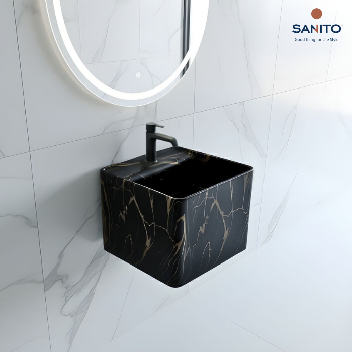 อ่างล้างหน้าแบบออกผนัง ดีไซน์ทรงเหลี่ยมสี่เหลี่ยมคมชัด โดดเด่นด้วยลวดลายหินอ่อนสีดำ-ทอง ให้ความรู้สึกเรียบหรู สะอาดตา เหมาะสำหรับห้องน้ำสไตล์โมเดิร์น มินิมอล และลักชัวรี ตัวอ่างออกแบบให้ติดตั้งแบบออกผนัง ช่วยประหยัดพื้นที่ ใช้งานสะดวก และดูเป็นระเบียบ