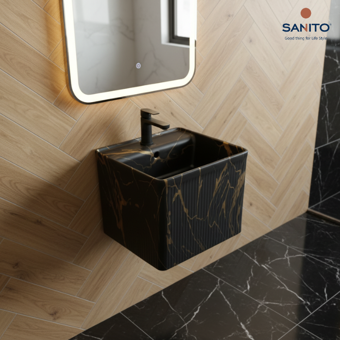 อ่างล้างหน้าแบบออกผนัง ดีไซน์ ทรงเหลี่ยม โดดเด่นด้วยลวดลายหินอ่อนสีดำ-ทอง พร้อมผิวด้านนอกเป็นลายริ้วแนวตั้งรอบตัวอ่าง ช่วยเพิ่มมิติและความสวยงาม เพิ่มมิติและเอกลักษณ์ให้กับห้องน้ำ เหมาะสำหรับพื้นที่ที่ต้องการดีไซน์โดดเด่นในสไตล์โมเดิร์น ติดตั้งแบบยึดผนังโดยไม่ต้องใช้ขาอ่างหรือเคาน์เตอร์ ช่วยประหยัดพื้นที่และทำให้ห้องน้ำดูโปร่ง เป็นระเบียบ